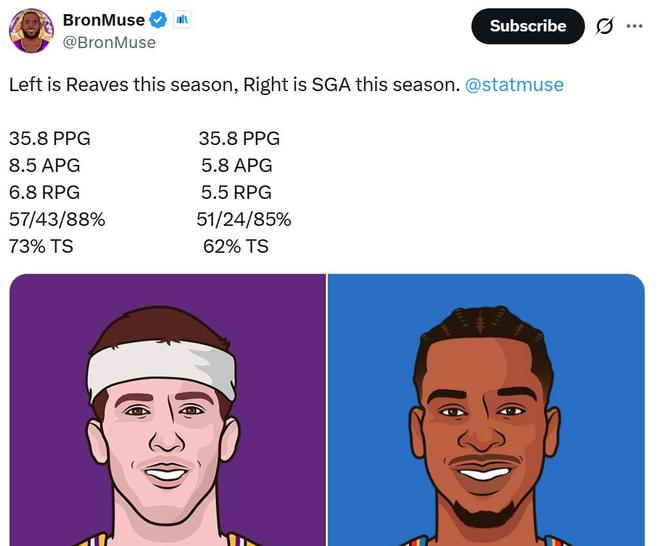 在效率与进攻数据全面性方面同样如此,里夫斯几乎完全碾压上个赛季的MVP亚历山大。